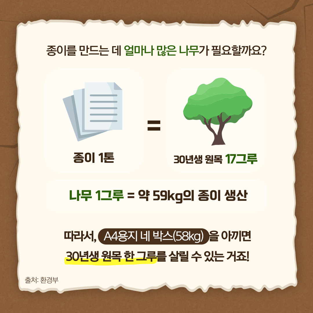 따라서, A4용지 네 박스(58kg)을 아끼면 30년생 원목 한 그루를 살릴 수 있는거죠!
