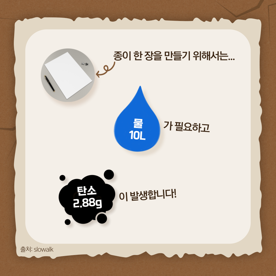 종이 한 장을 만들기 위해서는 물 10L가 필요하고, 탄소 2.88g이 발생합니다.